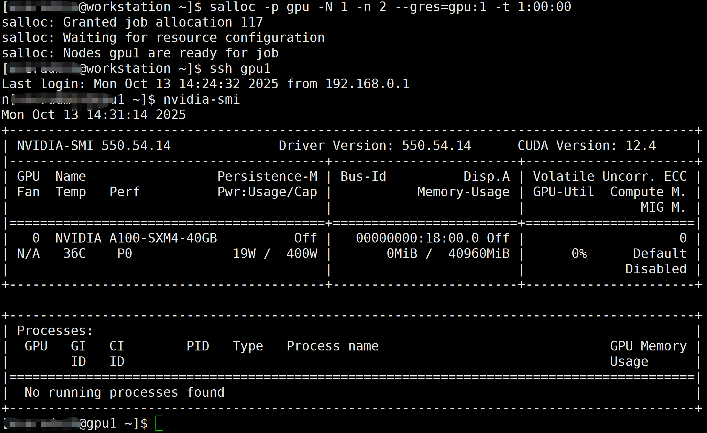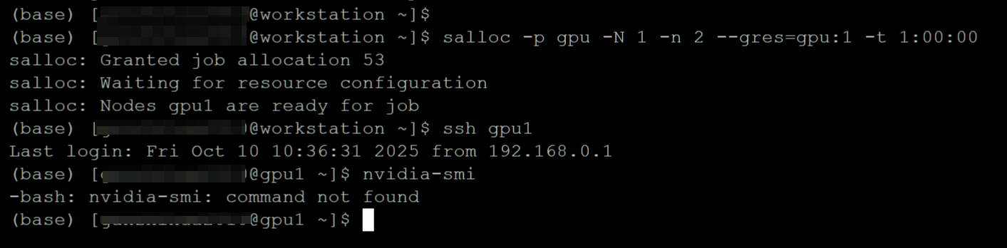 在公共集群使用salloc -p gpu -N 1 -n 2 --gres=gpu:1 -t 1:00:00申请gpu节点后,ssh gpu1到计算节点,然后执行nvidia-smi命令,显示-bash: nvidia-smi: command not found